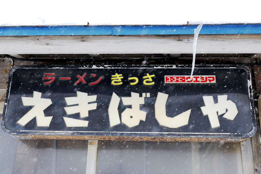 〔 釧網本線 止別駅 ホーム側の駅舎に「ラーメンきっさ・えきばしゃ」の看板 ! R. 7. 2. 17 撮影 〕
