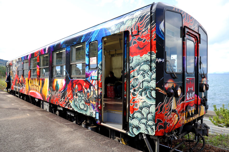 〔予土線 「鬼列車」 キハ32に鬼北町のシンボル「鬼王丸」など鬼をテーマとしたラッピング! R. 3. 11. 26撮影〕