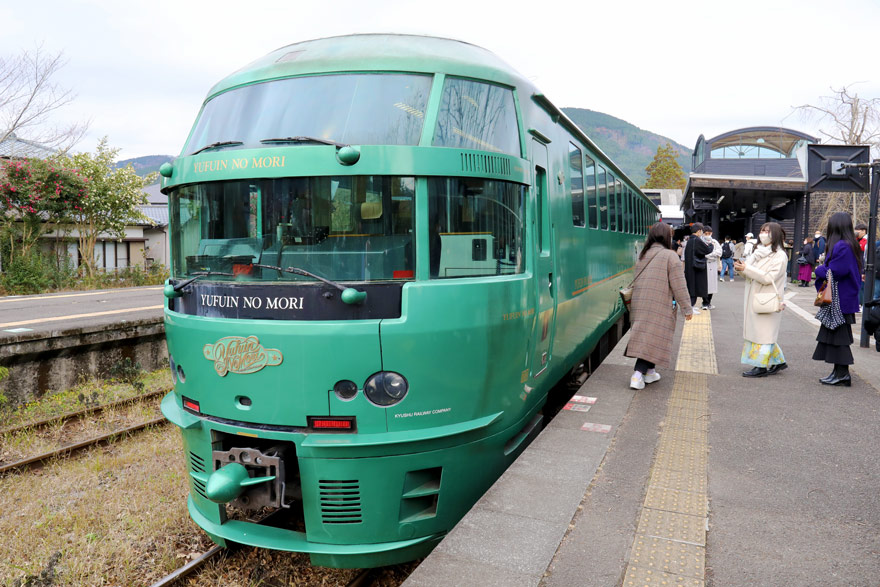 〔 由布院駅 「ゆふいんの森 Ⅲ世」 2時間14分の楽しい旅が終りを告げます! R.4. 12. 3 撮影 〕