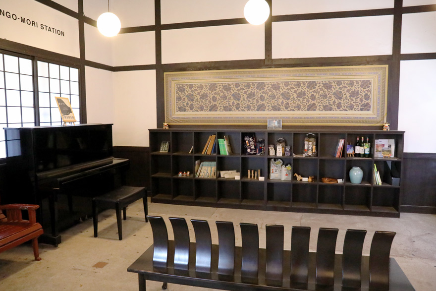 〔 久大本線 豊後森駅 待合室の隅にある本棚には、玖珠町の名産品などが飾られていた。 R.5. 4. 10 撮影 〕