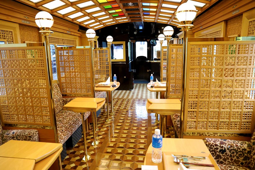 〔「ことこと列車」〔 2号車 〕ソファ席 ” 大川組子 ” 「ななつ星」といった豪華列車にも用いられている技術! 〕