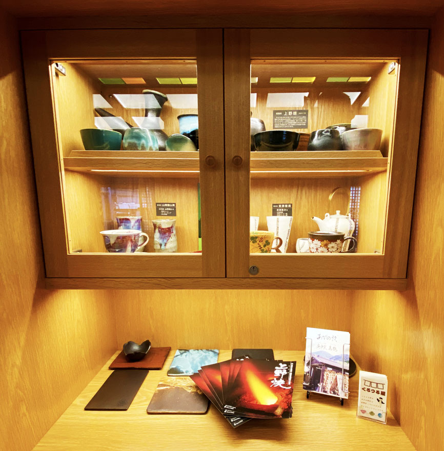 〔平成筑豊鉄道「ことこと列車」ショーケースの中にはフレンチコースの器にも使われている筑豊地方の工芸品などが展示〕