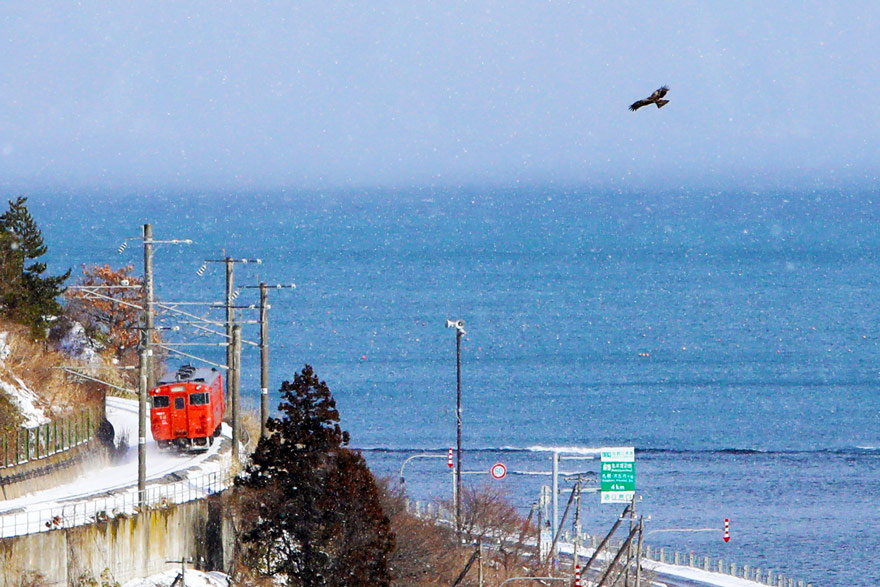〔 道南いさりび鉄道 茂辺地~渡島当別 津軽海峡が一望、青い海に朱色のディーゼルカーがよく映えます! 〕