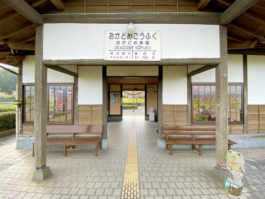 〔 くま川鉄道 おかどめ幸福駅 ホームから見た木造の神社風造りの立派な駅舎! R. 5. 4. 4 撮影 〕