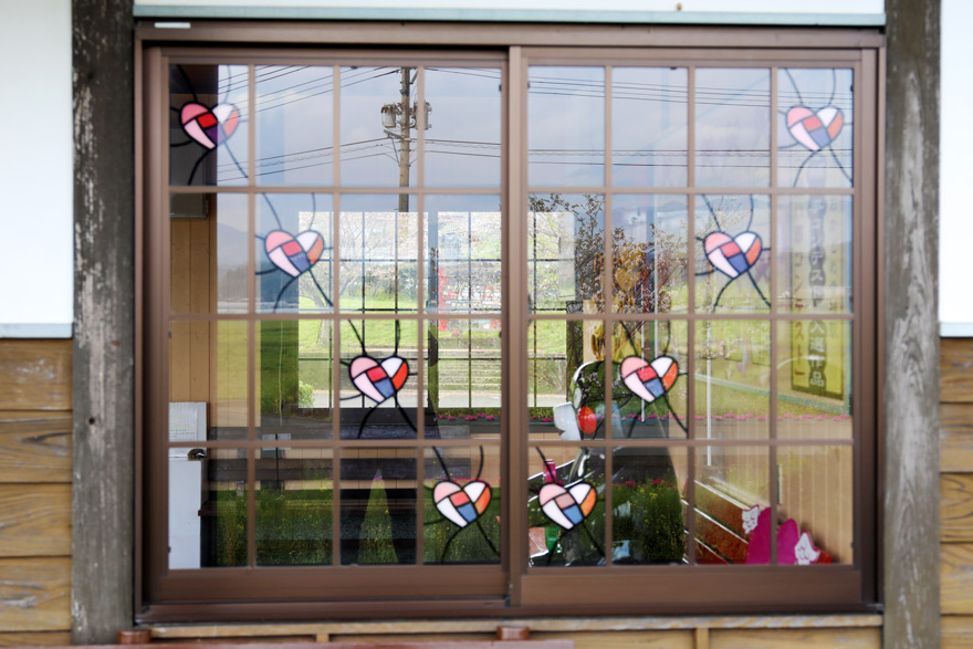 〔 くま川鉄道 おかどめ幸福駅 ハートで飾られた窓から! 駅舎内に「くまモン」が! R. 5. 4. 4 撮影 〕