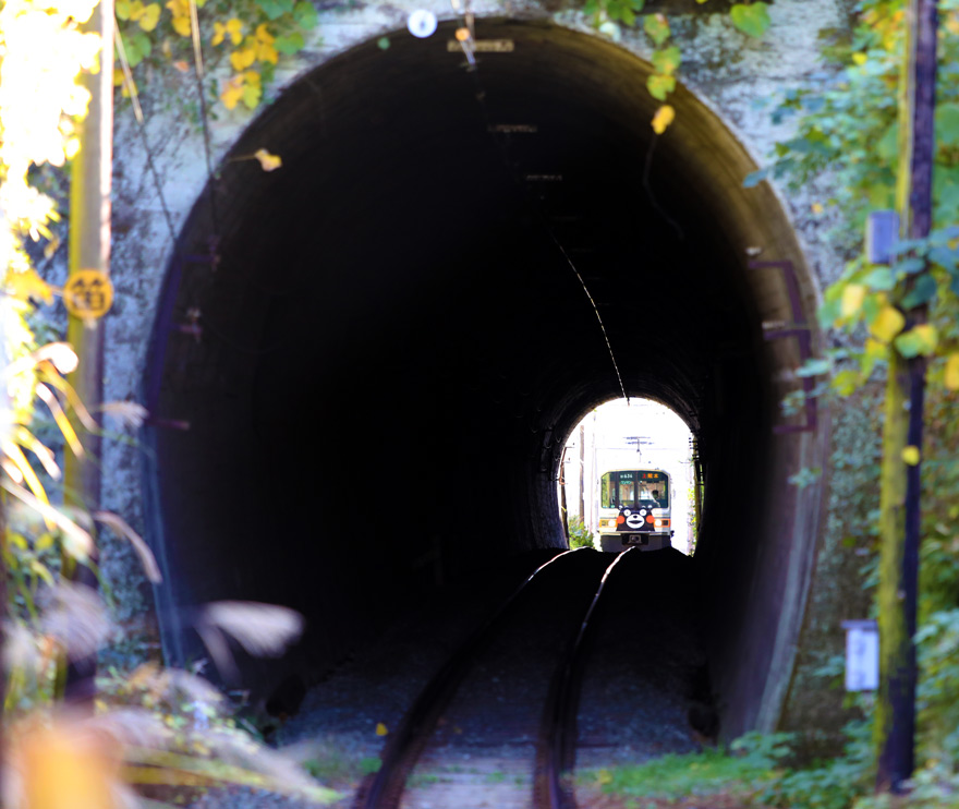 〔 熊本電鉄  池田~打越 トンネルを潜り池田駅に到着する! 01形 くまモンラッピング 電車  R.4. 11. 28 撮影 〕