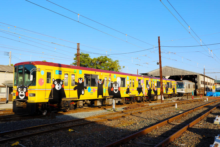 〔熊本電鉄 車両基地 01形135-635編成(元・東京メトロ・銀座線車両)”くまモン” ラッピング車両 R.4. 11.28撮影〕