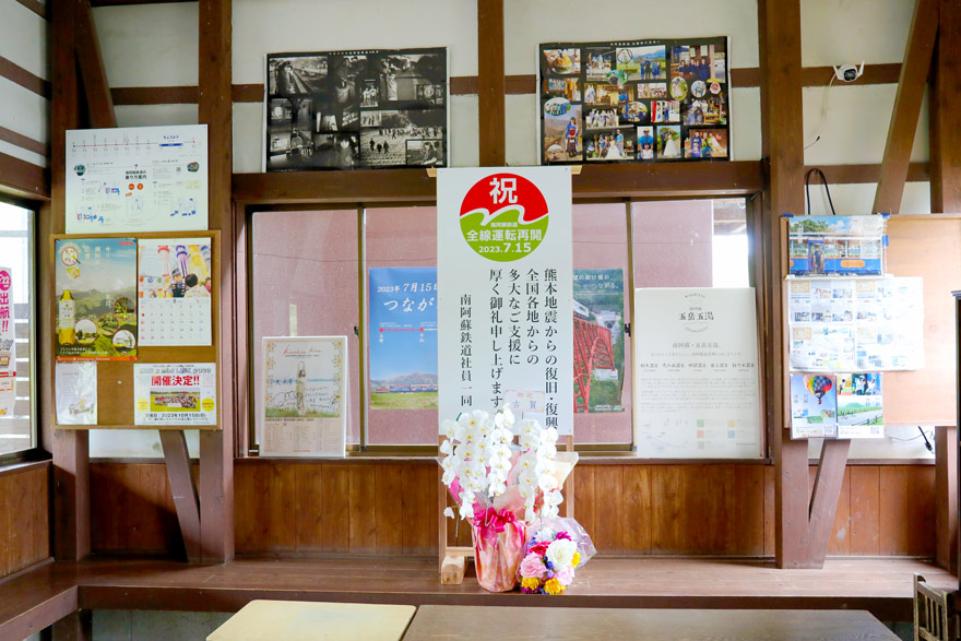 〔 南阿蘇鉄道 長陽駅 趣のある木造の駅舎内に ” 全線運転再開 ” のお祝い垂れ幕が! R. 5. 8. 23 撮影 〕