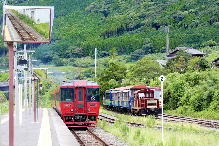 〔 南阿蘇鉄道 立野駅 「九州横断特急」とトロッコ列車「ゆうすげ号」が ご対面! R. 5. 8. 23 撮影 〕