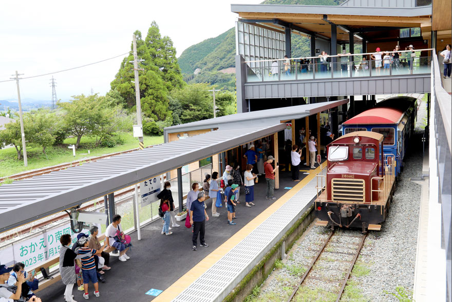 〔 南阿蘇鉄道 立野駅 トロッコ列車「ゆうすげ号」 大勢の観光客が待ち構えるホームへ! R. 5. 8. 23 撮影 〕