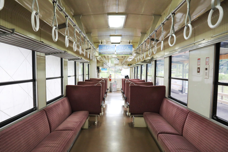 〔南阿蘇鉄道 ” MT-2003A形 ” 車内 中央にセミクロスシート4人掛けボックスシー トが通路の両側に4組ずつ配置!〕