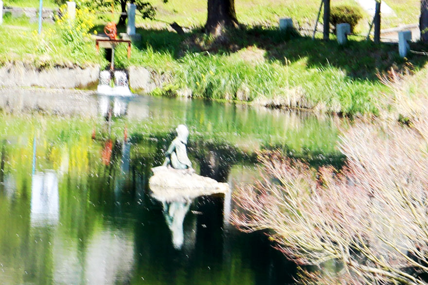 〔 南阿蘇鉄道 ” 明神池河童伝説 ” による河童の像! 待ち続ける女カッパの姿を再現して残された石の上に置いたそう? 〕