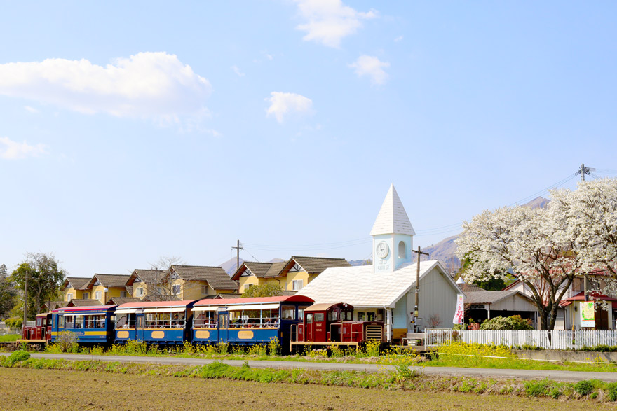 〔 南阿蘇鉄道  阿蘇山をバックに桜と菜の花がコラボの阿蘇白川駅を往く!       R. 5. 4. 3 撮影 〕