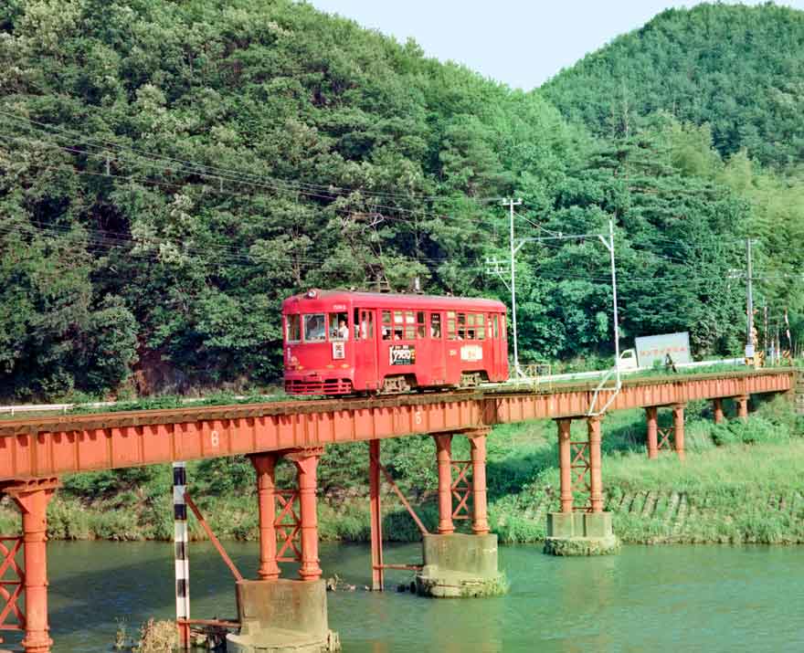 〔 名鉄/美濃町線 白金~上芥見にて 津保川の鉄橋を渡る ” モ580形 581 ” S.55.6.5撮影 〕