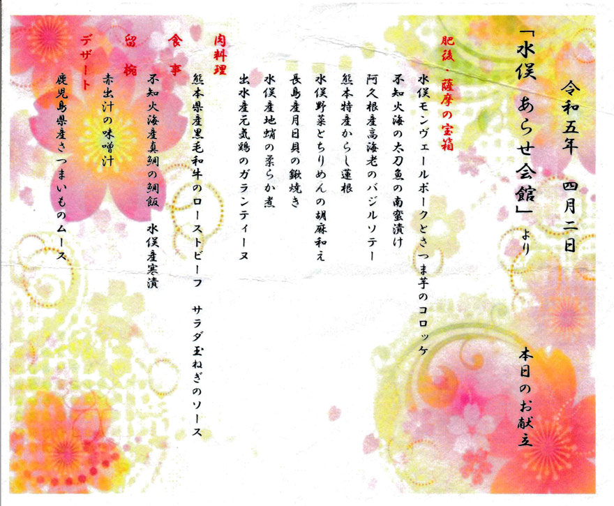〔 肥薩おれんじ鉄道 「おれんじ食堂」 3便 サンセット(夏ダイヤ) 献立表 R. 5. 4. 2 撮影 〕
