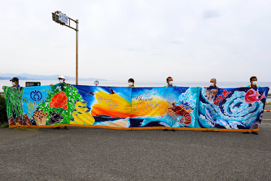 〔 肥薩おれんじ鉄道 牛ノ浜駅 地元阿久根市の皆さんの歓迎による大横断幕を掲げ、観光特急列車の到着を待つ! 〕
