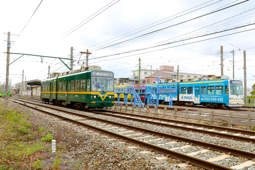 〔 筑豊電鉄 楠橋車両基地の前で 5000形 5002 とすれ違う! 3000形 3002 (阪堺電車コラボ塗装)黒崎駅前 行き 〕