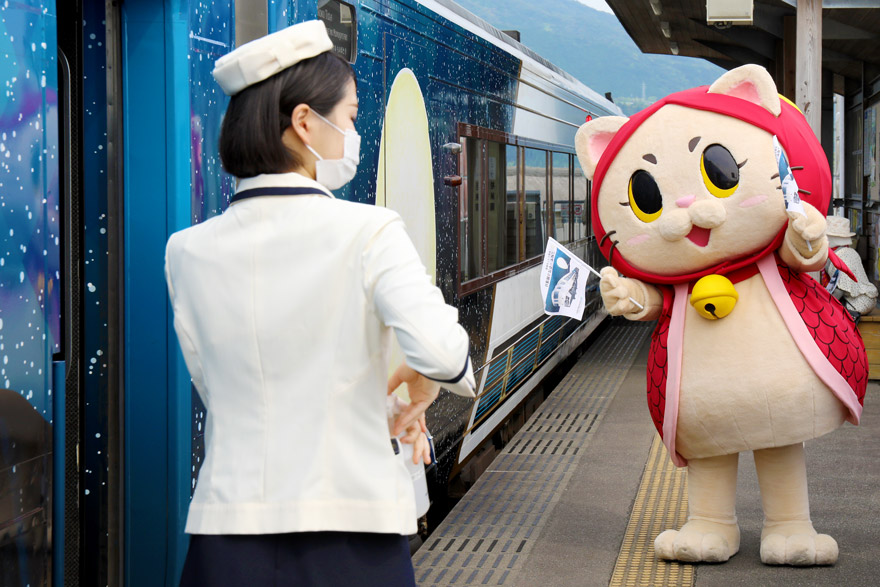 〔 奈半利駅 「志国土佐 時代の夜明けのものがたり」 お見送りに駆け付けたご当地応援キャラクター! 「きんめにゃん」〕