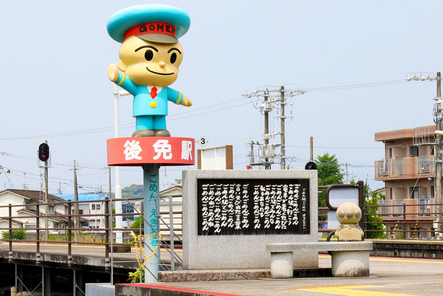 〔 土佐くろしお鉄道 後免駅 「ごめん えきお君」 やなせたかしさんデザインのモニュメントと後免駅の歌碑! 〕