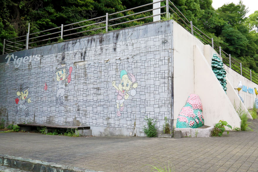 〔 土佐くろしお鉄道 球場前駅 安芸市営球場前の壁には阪神タイガースのマスコット ” トラッキーとラッキー ” !〕