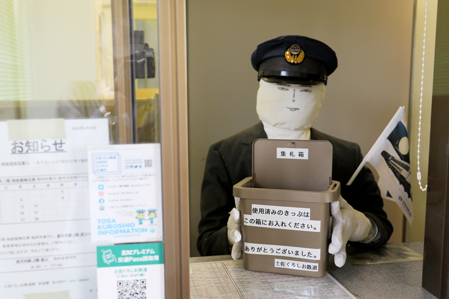 〔 土佐くろしお鉄道 奈半利駅 改札口には駅員に似せたユニークな人形が集改札業務! R.4. 6. 17 撮影 〕