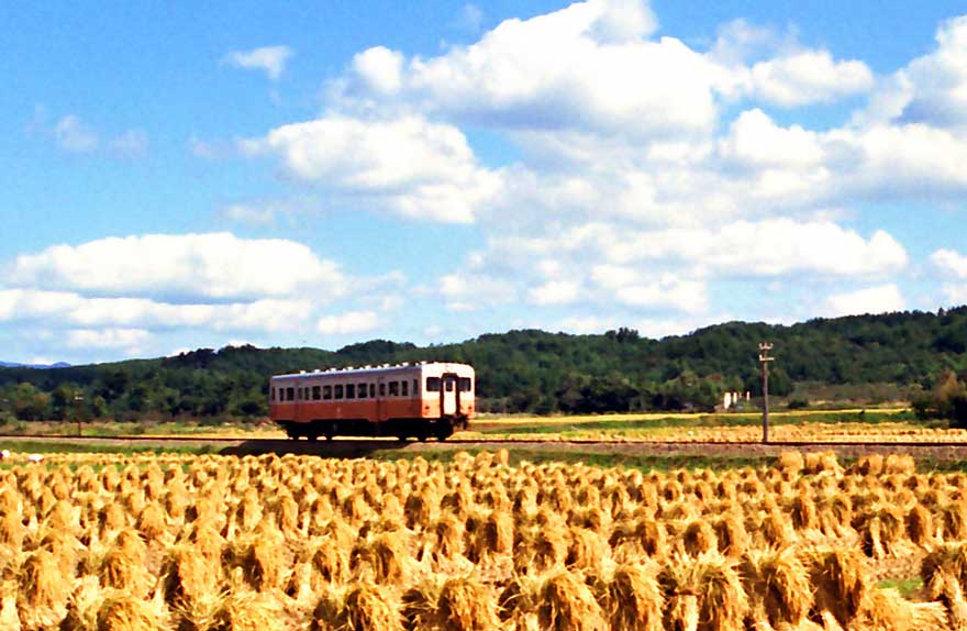 〔 津軽鉄道 毘沙門付近 稲刈りを終えた田園を行く! ” キハ 24000 形 ” S.53.10 撮影 〕