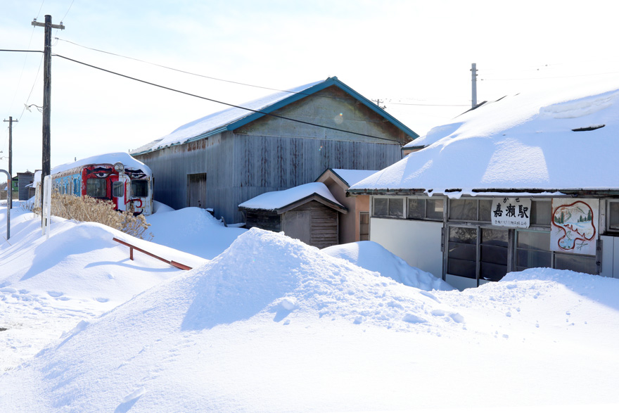 〔 津軽鉄道 嘉瀬駅 左側(津軽五所川原方面)に留置保存の「落書き列車」 キハ22形 22028 R. 7. 2. 8 撮影 〕