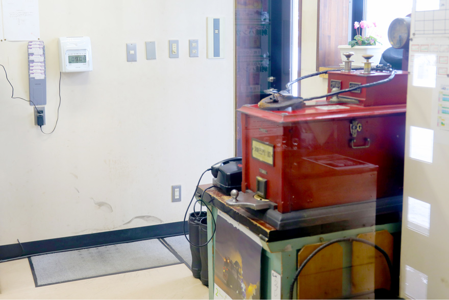 〔 津軽鉄道 金木駅 駅事務所にあるタブレット閉塞機で、下にタブレットキャリアが掛かっているのが見える! 〕