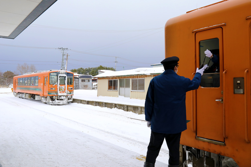 〔 津軽鉄道 金木駅 (タブレット閉塞式) 津軽中里行きが到着し運転士からタブレット受け取る! 〕