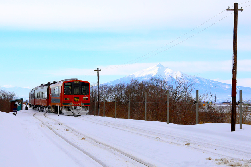〔 津軽鉄道 津軽富士とも呼ばれる岩木山を背景に金木駅に到着! 「ストーブ列車」津軽中里行き R. 7. 2. 8撮影 〕