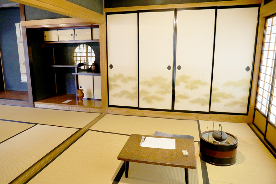 〔「太宰治疎開の家」(旧津島家新座敷) 疎開当時を再現して津軽塗の座卓と火鉢が置かれた書斎! 実際に座われます 〕