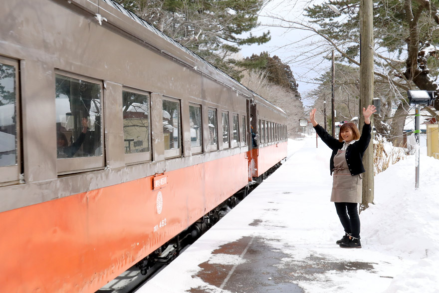〔 津軽鉄道 芦野公園駅 喫茶店「駅舎」から出ての笑顔のお手振り! 旅行者の心が癒されますね。 〕