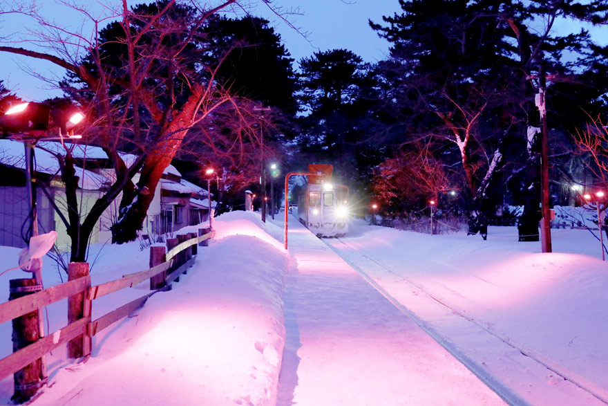 〔 津軽鉄道 「雪さくらレール・トンネルin芦野公園駅」 駅に到着する! 津軽21形「走れメロス号」 五所川原行き 〕