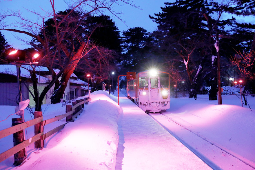 〔 津軽鉄道 「雪さくらレール・トンネルin芦野公園駅」 駅に到着する! 津軽21形「走れメロス号」 五所川原行き 〕