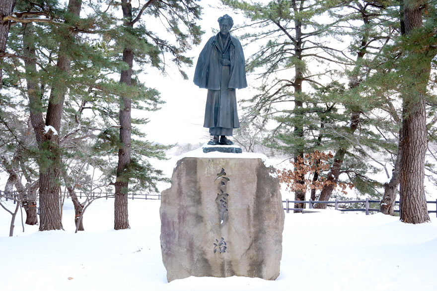 〔 津軽鉄道 芦野公園 太宰治の銅像は2009年に太宰治生誕100年を記念して作られたもの! R. 7. 2. 7 撮影 〕