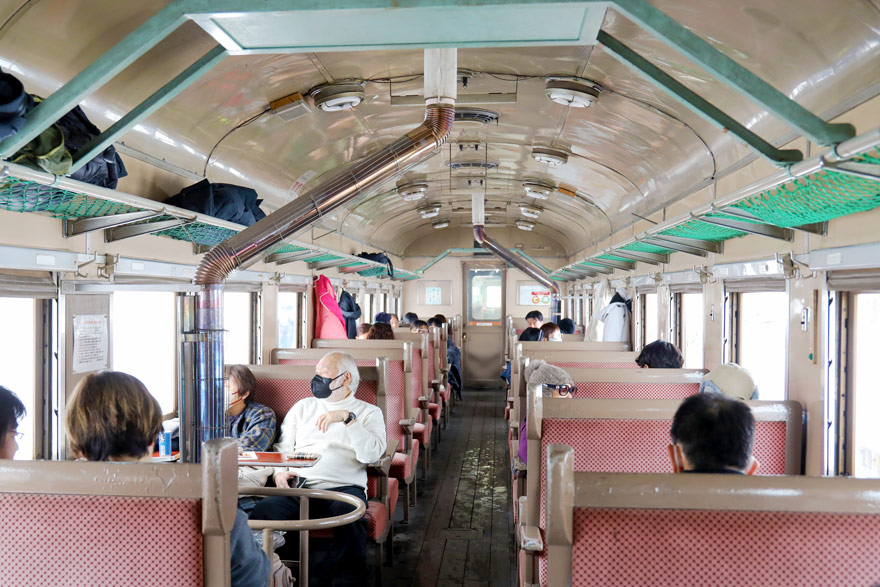 〔 津軽鉄道「ストーブ列車」 客車にダルマストーブ、向かい合わせの座席や木製の窓枠などレトロな昭和時代の客車! 〕