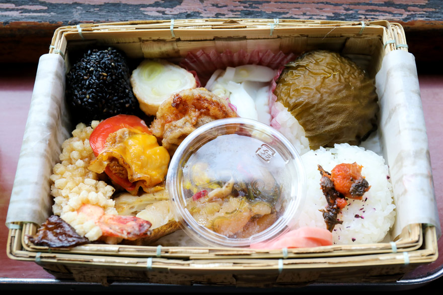 〔 津軽鉄道 事前に予約していた 「ストーブ弁当」 竹を編んで作った弁当かごに地元の食材をふんだんに使用! 〕