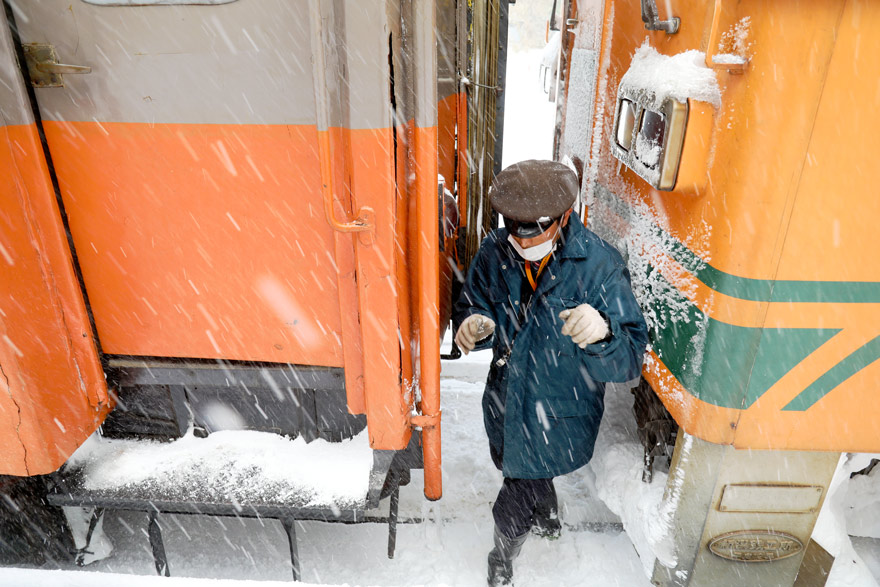 〔 津軽鉄道 津軽中里駅 連結の確認、各ホースの切替え等、雪の降りしきるなかご苦労様です! R. 7. 2. 7 撮影 〕