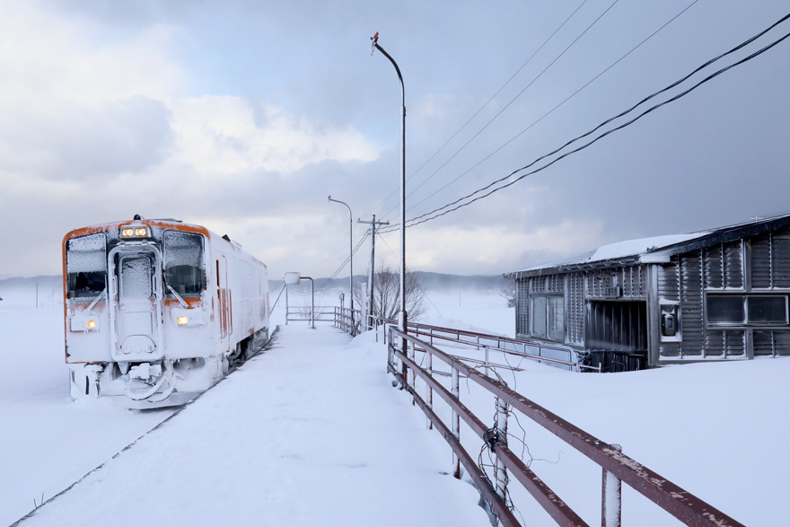 〔 津軽鉄道 大雪で吹雪く中、五農校前駅に到着! 津軽21形「走れメロス号」津軽五所川原行 R. 7. 2. 7 撮影 〕