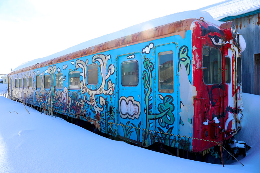 〔 津軽鉄道 嘉瀬駅 津軽地方の子供たちとともに、津軽鉄道の列車に描いたアート作品を20年ぶりに修復! 〕