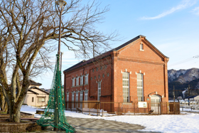 永平寺口駅前に建つレンガ建ての建物。