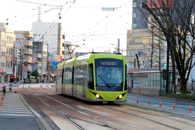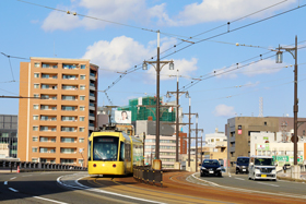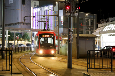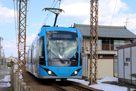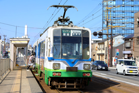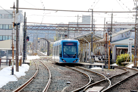 停留場までの0.7km(通称ヒゲ線)が道路上を走る併用軌道区間となっている。