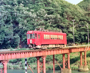 津保川の鉄橋を渡りR80のカーブを曲がる ” モ580形 581 ”
