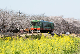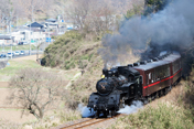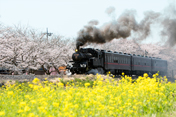 号機が牽引する「SLもおか」号が運転されています。 今回、菜の花と桜が満開の季節に訪れました。