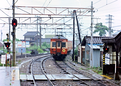 踏切の右側をわたると2番線で宇奈月温泉・黒部峡谷、
