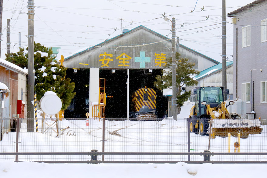 〔 函館市電 駒場車庫 工場の前にはササラ式除雪車、奥にはジャッキが2基設置されている。 R. 7. 2. 10 撮影 〕