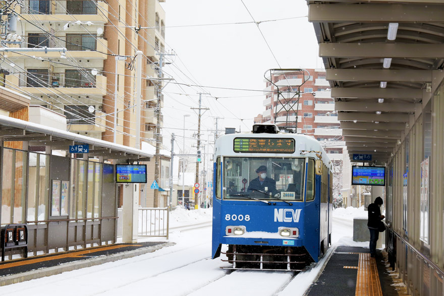 〔 函館市電 十字街停留場に到着する! 8000形 8008 谷地頭行き R. 7. 2. 10 撮影 〕