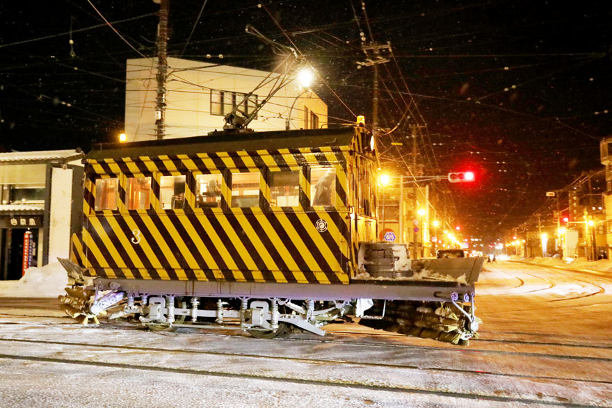 〔 函館市電 排雪3号車(ササラ式除雪車) 十字街交差点を渡り函館どっく前へ向かう! R. 7. 2. 10 撮影 〕