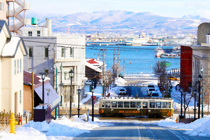 〔 函館市電 函館港を背景に往く! 710形 723 函館どっく前 行き (八幡坂から撮影) R. 7. 2. 9 撮影 〕