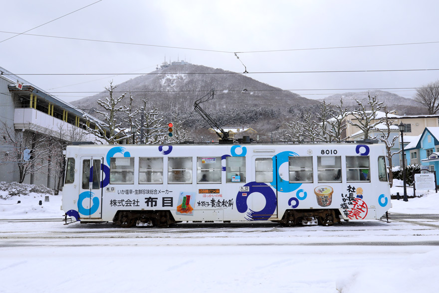 〔 函館市電 雪道の基坂 展望台のある函館山を背景に往く! 8000形 8010 函館どっく前行き R.7. 2. 10 撮影 〕